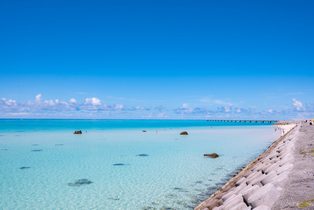 広がる白砂と透明度抜群の海が特徴。シンプルでダイナミックなロケーションで、宮古島ビーチの定番